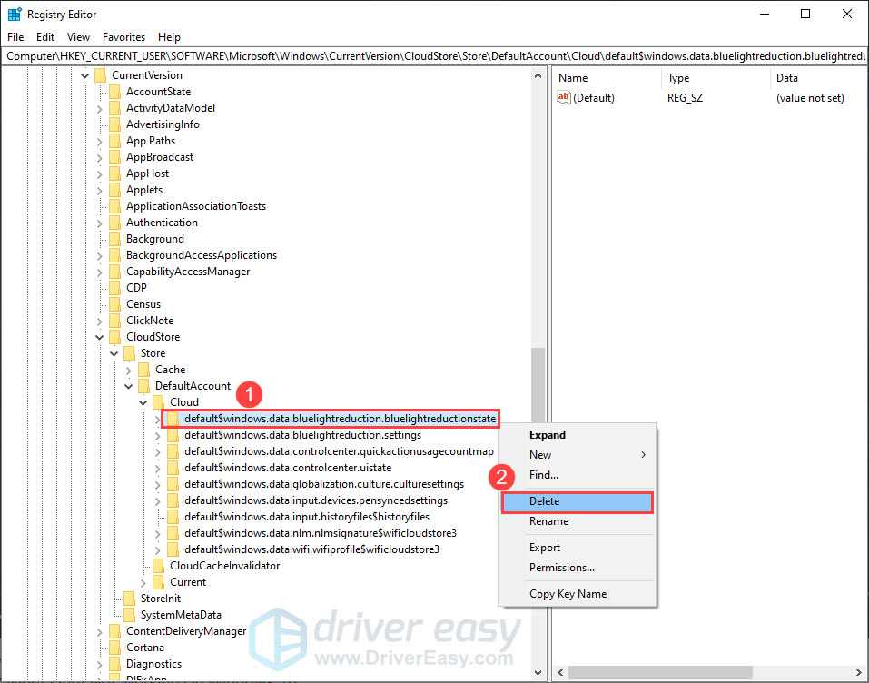 - Under the Cloud key, right-click and delete the first two registry keys one by one.