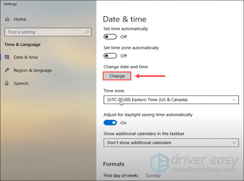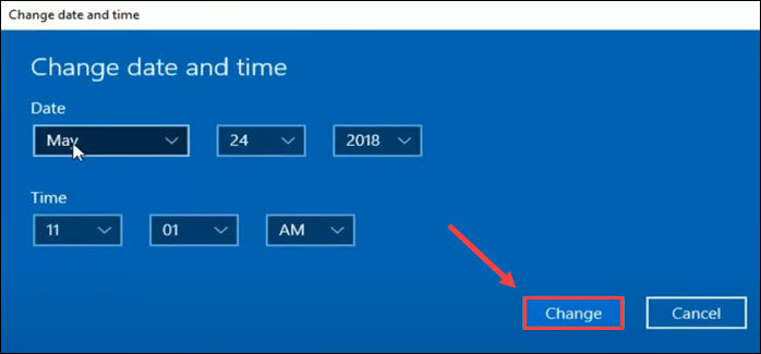 Note: the options for Set time automatically and Set time zone automatically must be set to Off to make this change. - Change the date and time according to your need, then click Change.