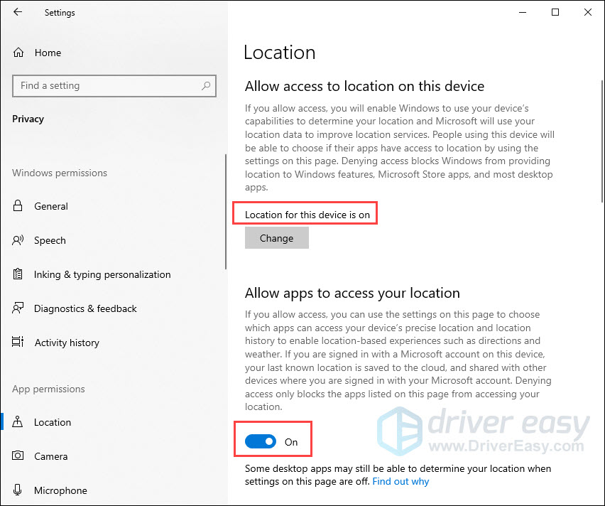 - Make sure the Location for this device is On. If not, you can click the Change button to turn it on. Also, make sure that Allow apps to access your location is set to On.