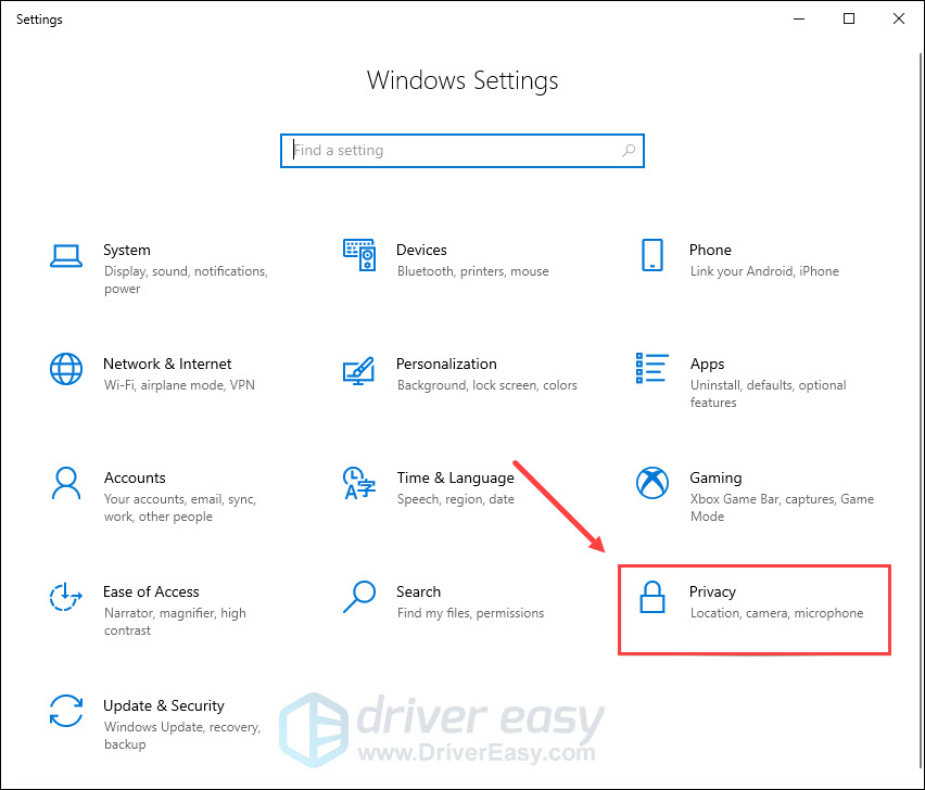 - On your keyboard, press the Windows logo key and I together to open Windows Settings. Then click Privacy.