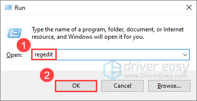 - On your keyboard, press the Windows logo key and R at the same time to invoke the Run dialog. Then type regedit and click OK to open Registry Editor.