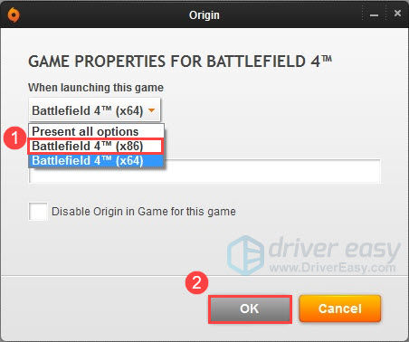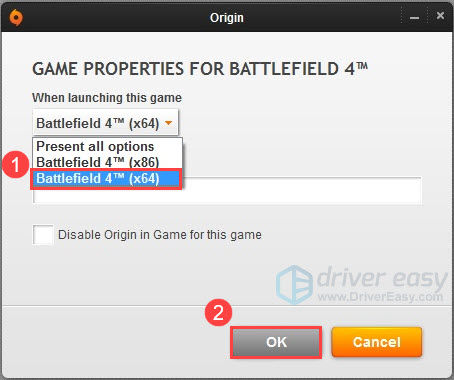- Repeat step1 and step 2, then change game properties back to Battlefield 4™ (x64) and click OK.
