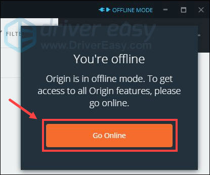 - Once the menu says you’re offline, switch windows to the Origin menu, then click Go online.