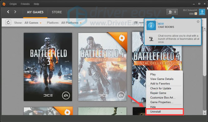 - Right-click the Battlefield 4 tile from the list, and select Uninstall.
