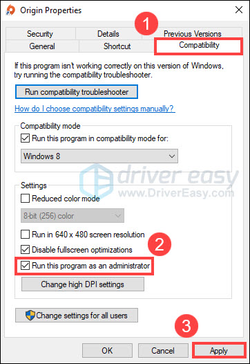 - Navigate to the Compatibility tab, Then check the box next to Run this program as an administrator and click OK.