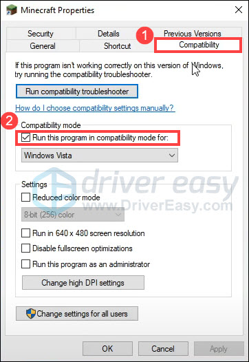 Some older games might run poorly in the most recent version of Windows 10. To see if that’s the case for Minecraft, try running the game in compatibility mode. Here’s how: