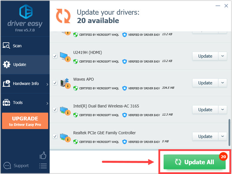 - Click Update All to automatically download and install the correct version of all the drivers that are missing or out of date on your system. (This requires the Pro version — you’ll be prompted to upgrade when you click Update All.)