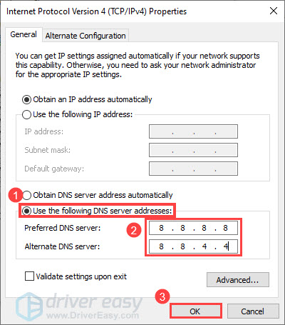 - Select Use the following DNS server addresses:. For Preferred DNS server, type 8.8.8.8; and for Alternate DNS server, type 8.8.4.4. Click OK to save the changes.