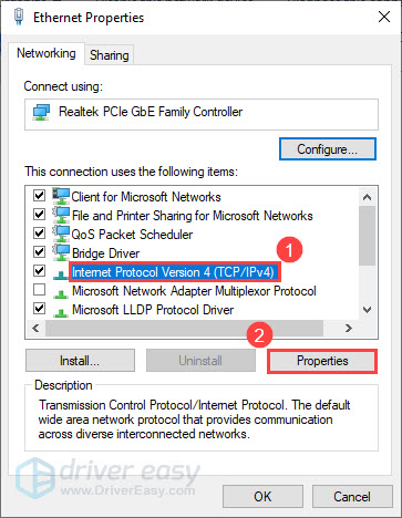 - Select Internet Protocol Version 4 (TCP/IPv4) and click Properties.