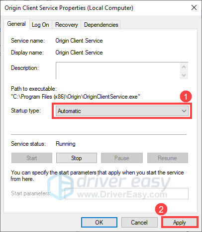 - Next to Startup type, click the drop-down menu and select Automatic. Then click Apply.