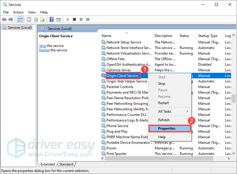 - In the Services window, find Origin Client Services, then right-click on it and select Properties.