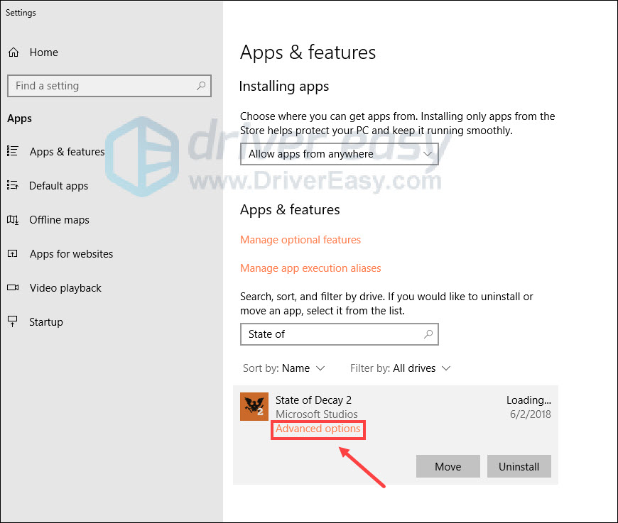 - Under Apps & features, click State of Decay 2, then click Advanced options.