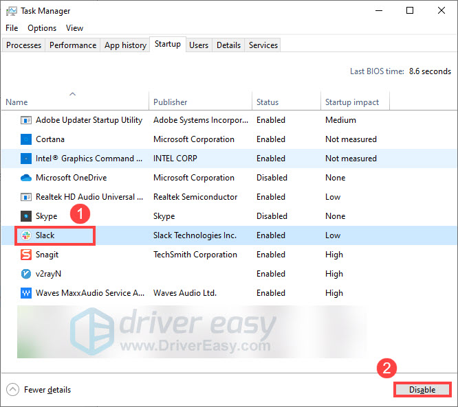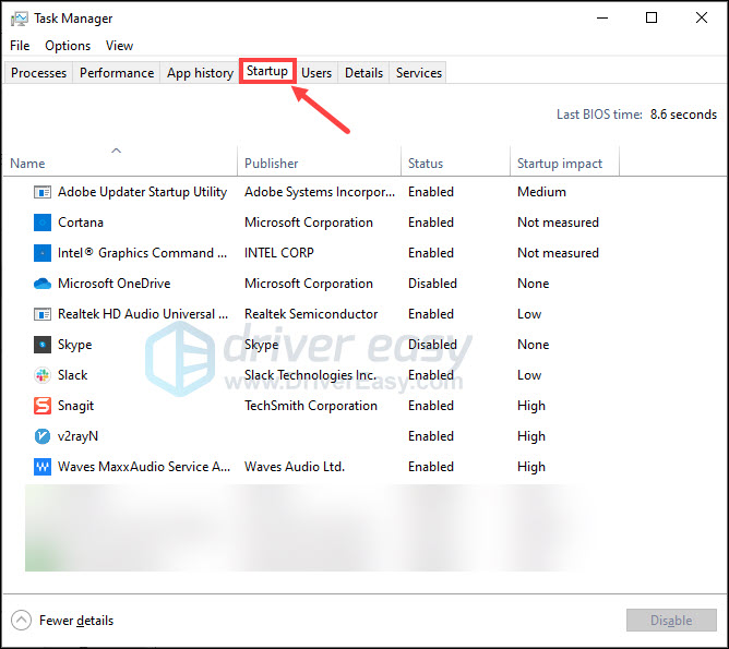 - On your keyboard, press Ctrl, Shift and Esc at the same time to open Task Manager, then navigate to the Startup tab.