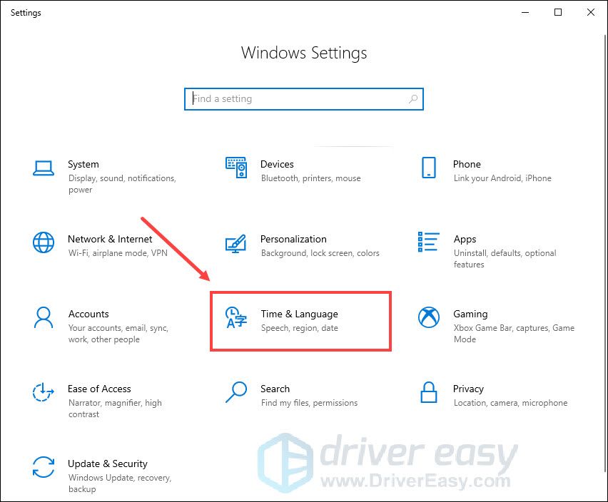 - On your keyboard, press the Windows logo key and I at the same time to open Windows Settings. Then click Time & Language.