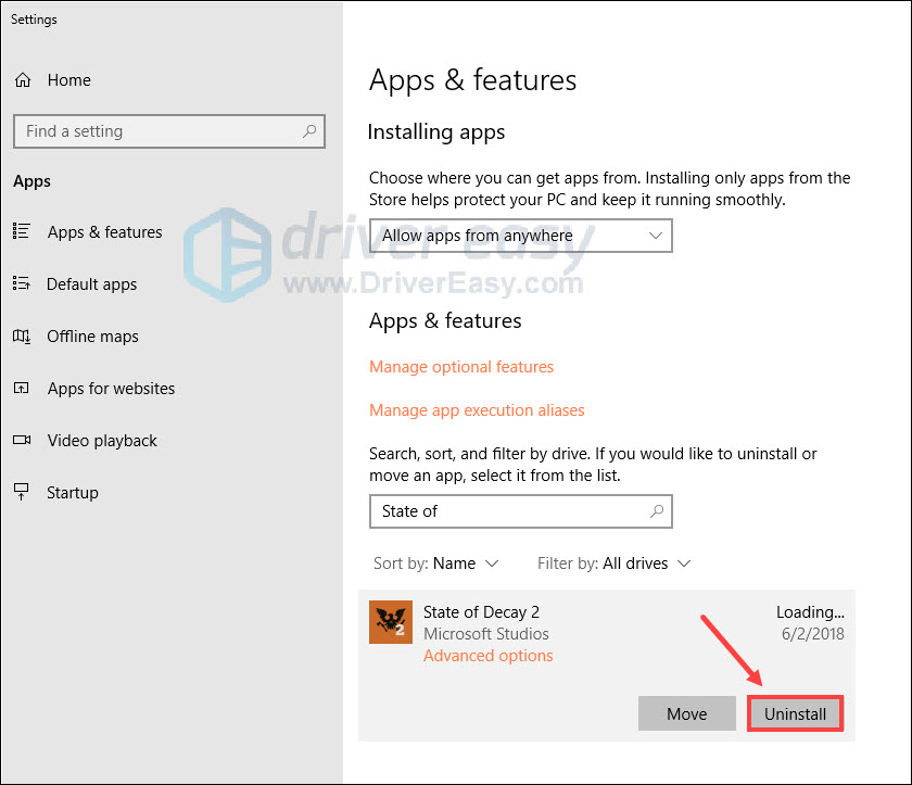 - Under Apps & features, click State of Decay 2, then select Uninstall.