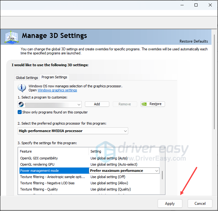- In the Specify the settings for this program: section, scroll down to find the Power management mode, then select Prefer maximum performance.