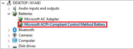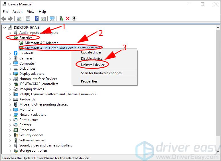 - Double click Battery to expand the category, and right-click your Microsoft ACPI-Compliant Control Method Battery driver, then click Uninstall device.