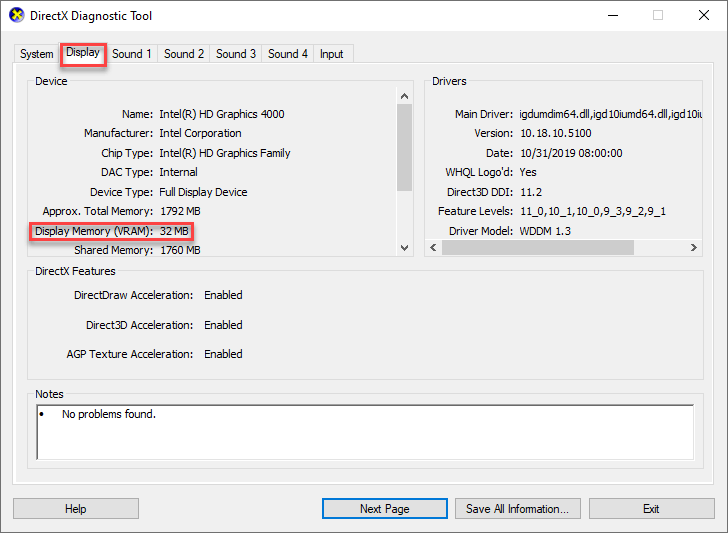 - Select the Display tab, and you’ll be presented with the information about your graphics card.