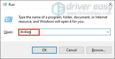- On your keyboard, press the Windows logo key and R at the same time, then type dxdiag and press Enter.