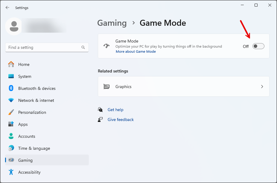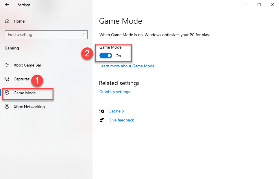 - In the left panel, click Game Mode, then switch the toggle for Game Mode to the opposite status.