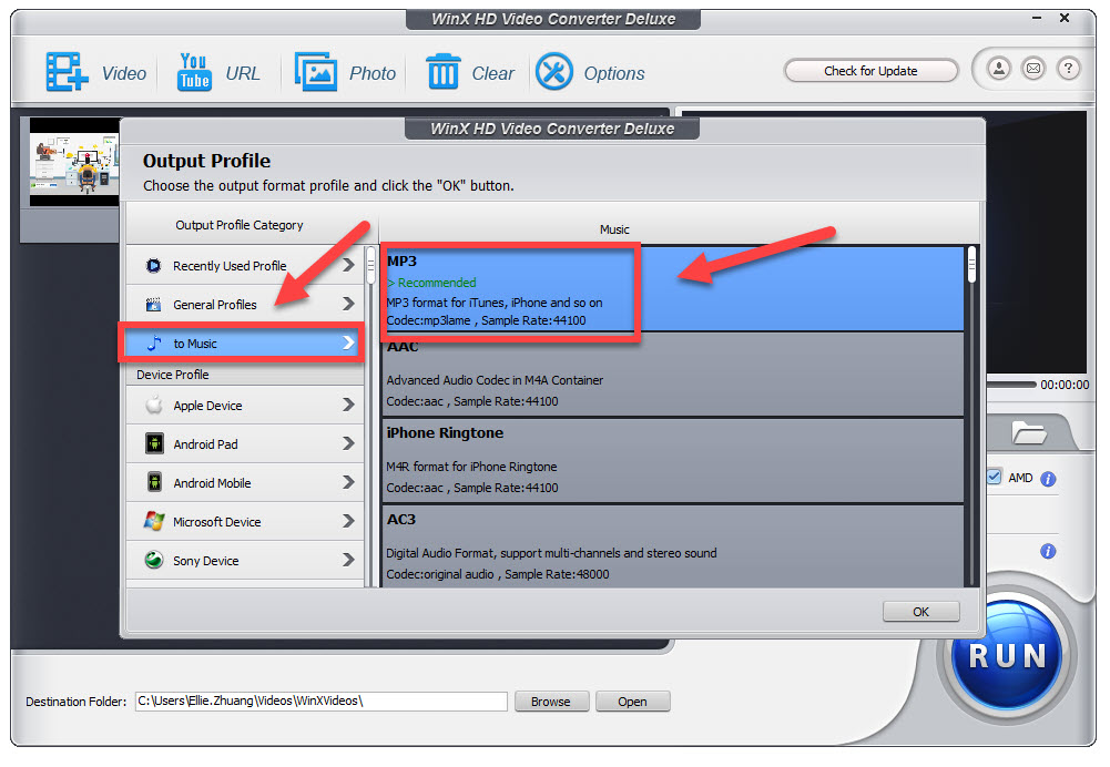 4) In the Output profile section, click to Music, choose MP3, and click OK .