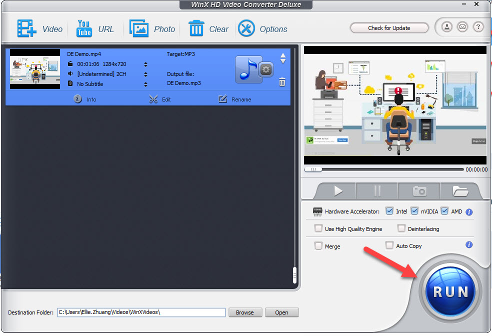5) Click Run at the bottom right. WinX HD Video Converter Deluxe will automatically convert the file for you.