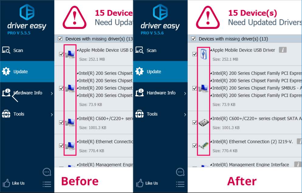 Hooray! Another Driver Easy update is here to meet you!Today we roll out Driver Easy 5.5.6, a brand new version bringing you newly-added features and better user experience.Thanks for your warm-hearted suggestions and long term support, we’re able to keep going forward. So today we’re releasing the latest version, don’t miss out!1.We improve the driver icons in the Devices with missing driver(s) category now, which indicate the driver types. We’ve always had specific driver icons in the Device with outdated driver(s) and the Unplugged device(s) categories. In the Devices with missing driver(s) category, we used to use an identical icon:. Now we add specific icons in the Device with missing driver(s), so you can see what type of drivers are missing accordingly.