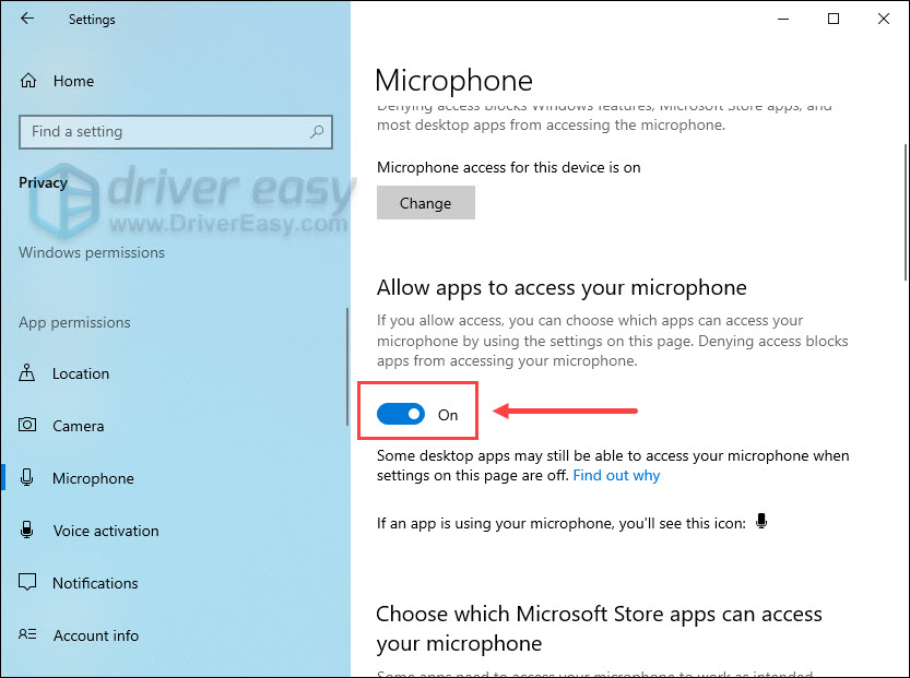 - Under Allow apps to access your microphone, make sure the toggle is set to ON. If not, you can click the Change button above to turn it on.