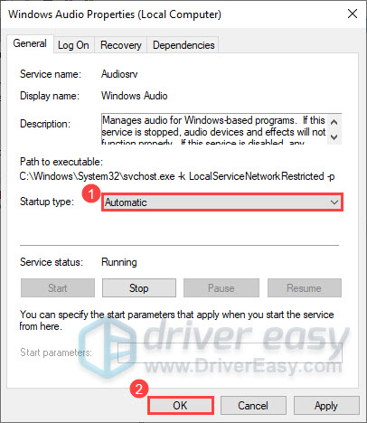 - In the Windows Audio properties window, check if the Startup type is set to Automatic. If not, set it to Automatic and click OK to save the changes.