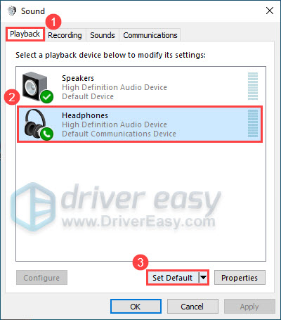 - Choose the Playback tab, select the headphones you want to use, and click Set Default.