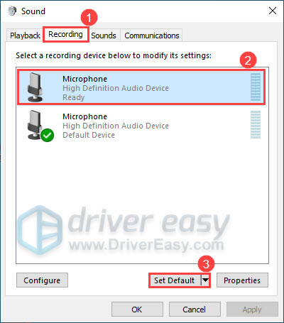 - Navigate to the Recording tab, select the microphone you want to use, and click Set Default.
