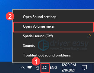 - On your taskbar, right-click the Speakers icon and select Open Volume mixer.