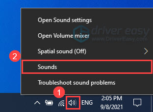 - Right-click the Speakers icon again and select Sounds.