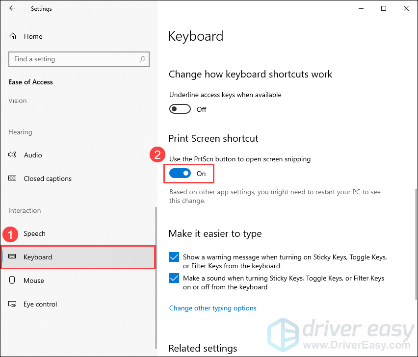 - In the left panel, select Keyboard. Under Print Screen shortcut, toggle the switch to On.