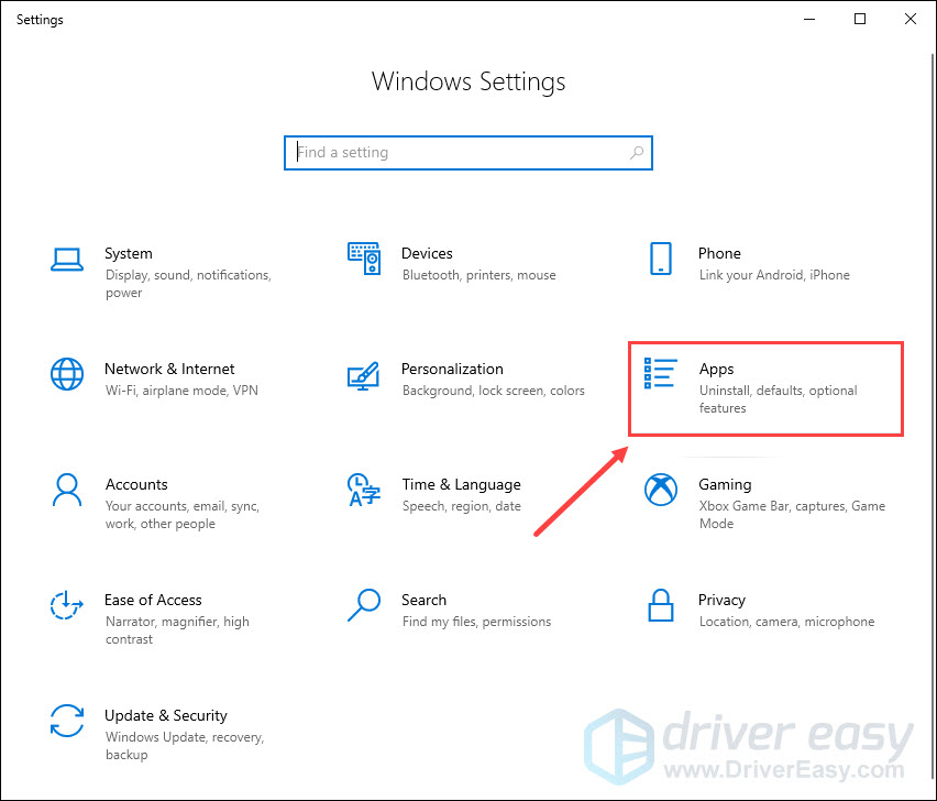 - On your keyboard, press the Windows logo key + I simultaneously to open Windows Settings, then select Apps.