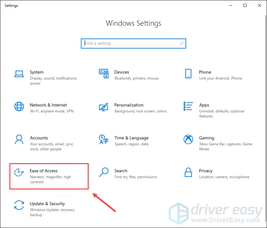 - On your keyboard, press the Windows logo key + I at the same time to open Windows Settings. Then select Ease of Access.