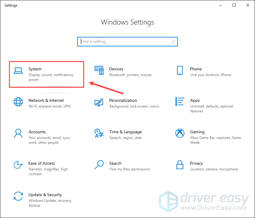 - On your keyboard, press the Windows logo key + I simultaneously to open Windows Settings, then select System.