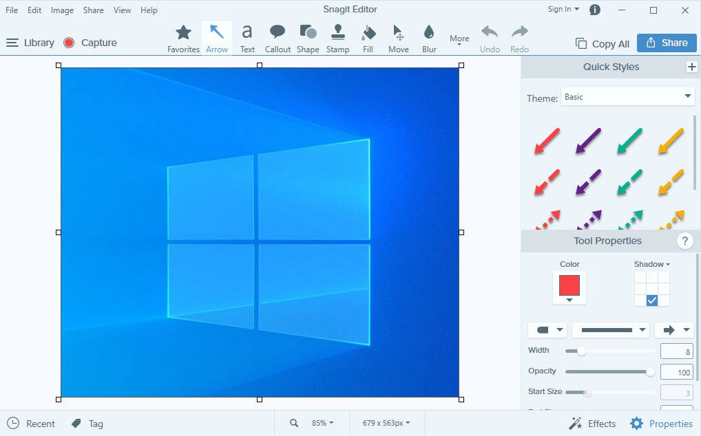- Once taken, the screenshot will open up in the Snagit Editor. From there, you can edit the image, such as cropping the image, blurring particular areas, and adding arrows, shapes, icons or text. Once done, you can choose to save it on your desktop, copy it to your clipboard, email it to someone or share it online.