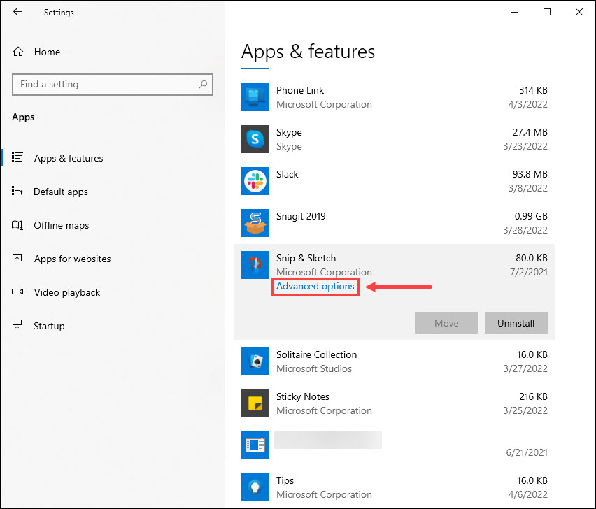 - Under Apps & features, scroll down the page and click Snip & Sketch. Then select Advanced options.