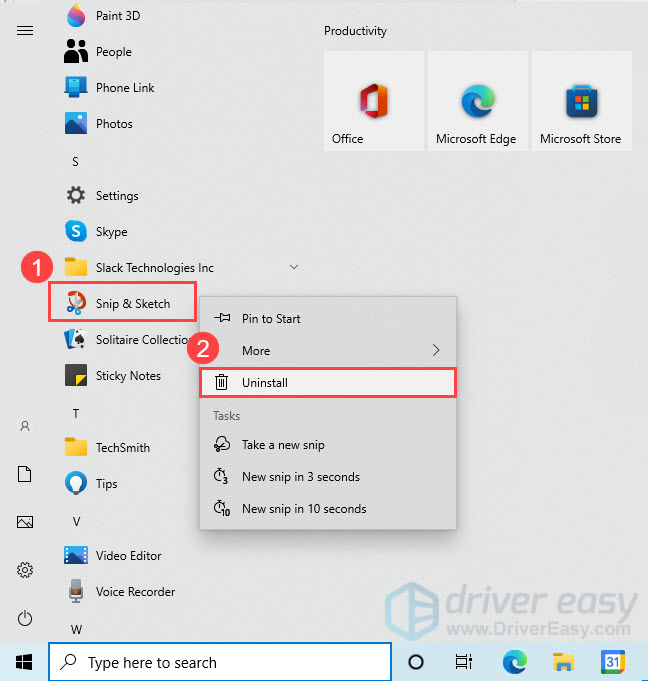 - On your keyboard, press the Windows logo key to open the Start menu. Then right-click Snip & Sketch and select Uninstall.