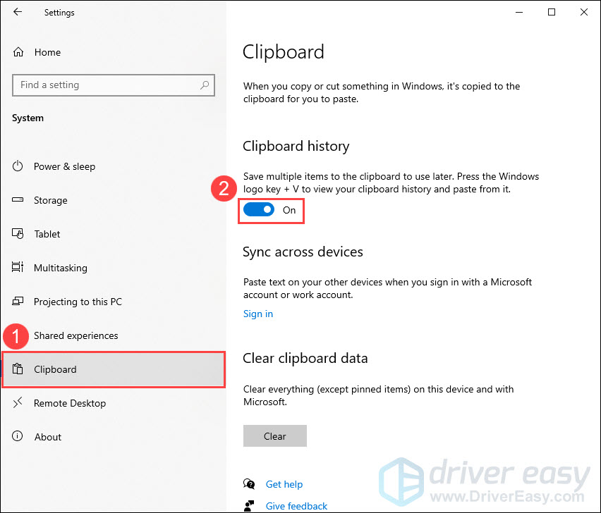 - In the left panel, select Clipboard, then turn on Clipboard history.