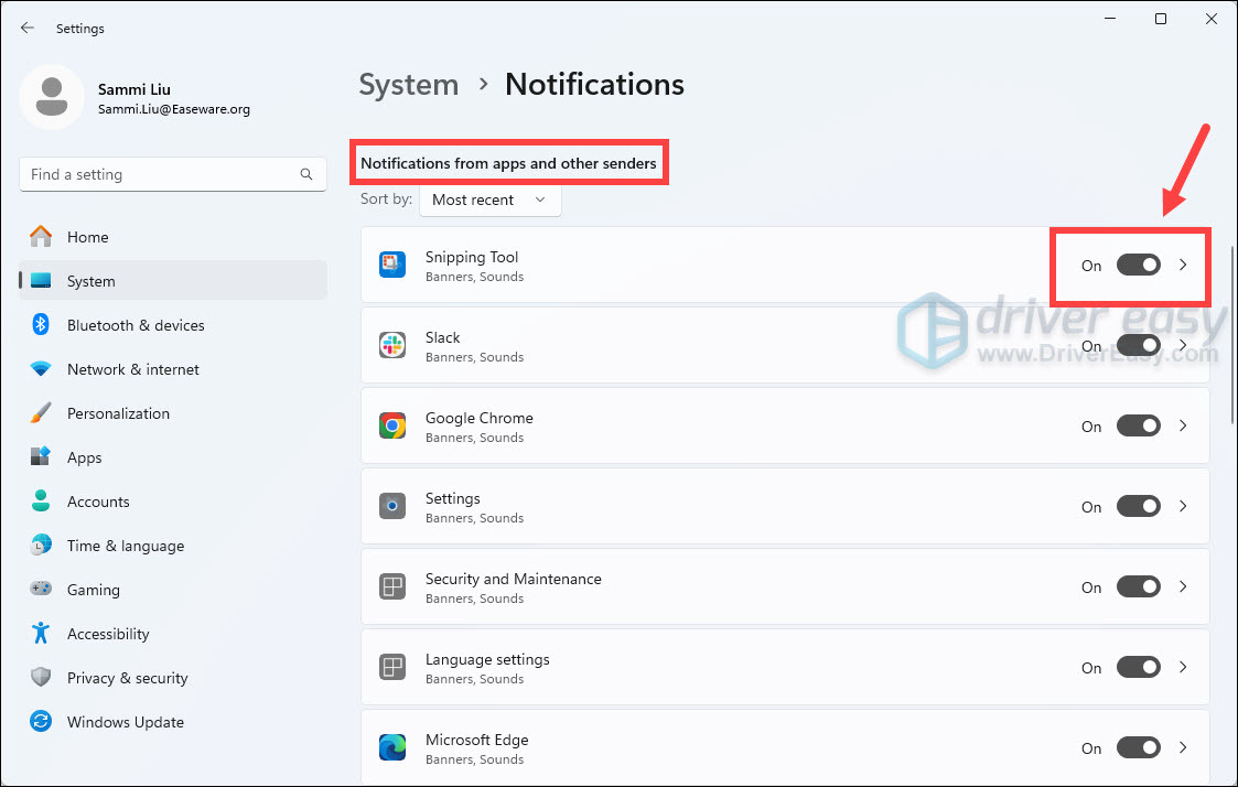 - Under the Notifications from apps and other senders section, make sure the Snipping Tool is On.