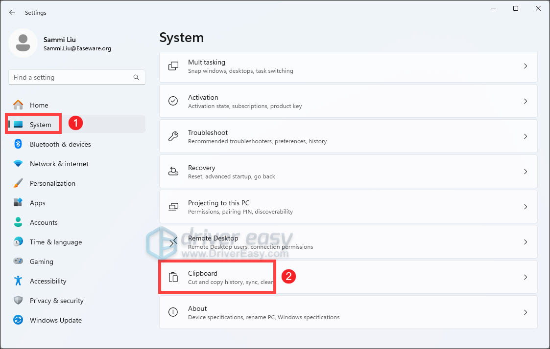 - Select System. Then on the right side, scroll down until you find Clipboard. Click on it.