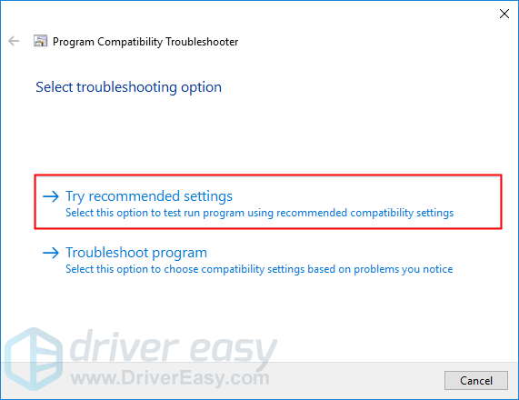 - Click Try recommended settings to test-run the program using recommended compatibility settings. Follow the on-screen instructions to see whether this troubleshooting option works or not.