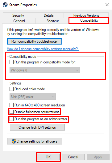 - Compatibility mode: If your Steam client keeps crashing on your current Windows system, click the drop-down list to select a previous version of Windows system to test-run it.