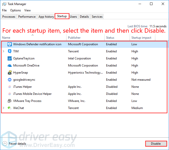 - On the Startup tab in Task Manager, for each startup item, select the item and then click Disabled.