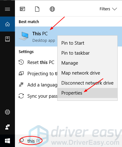 - Type this PC/My Computer/computer (according to your operating system) in the search box from Start. Then right-click on it from the result to select Properties.