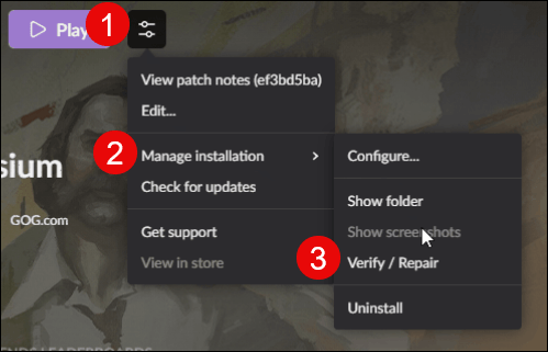 Launch GOG, and select Baldur’s Gate 3. Click the Customization button, and choose Manage installation > Verify / Repair.