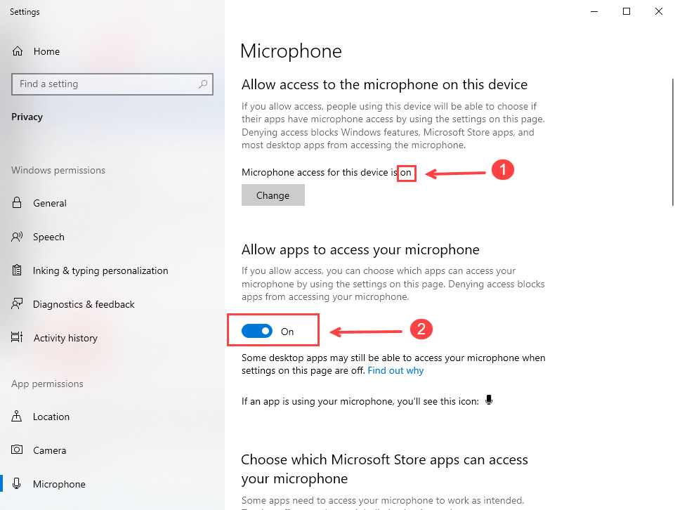 2) Please be sure to turn on “Allow access to the microphone on this device” and “Allow apps to access your microphone“.