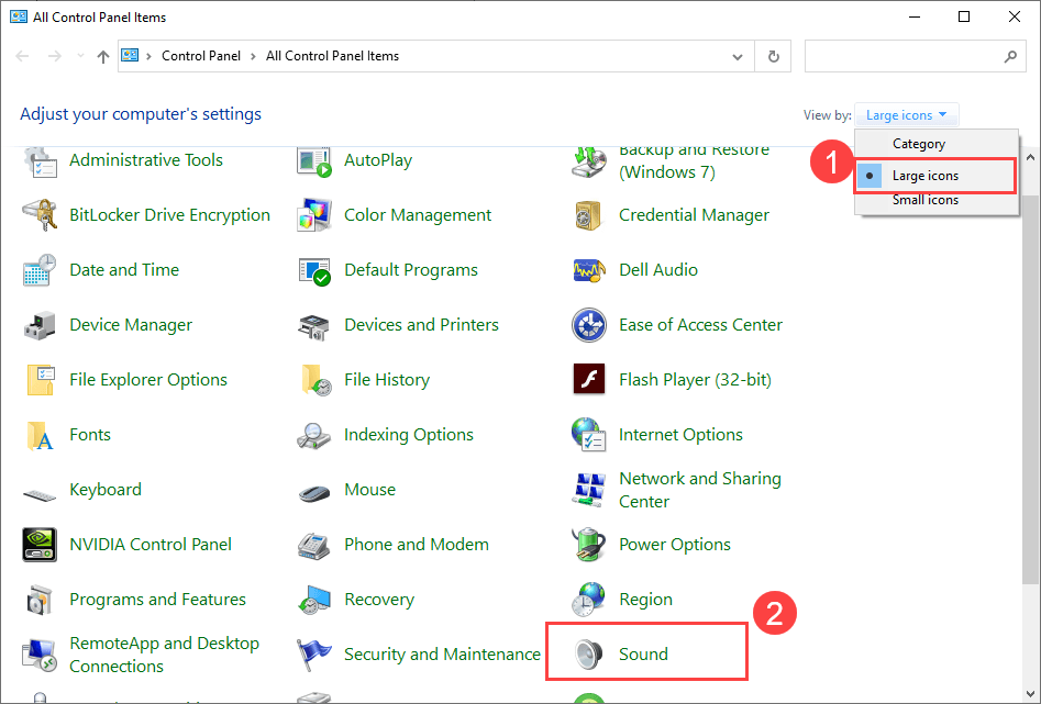 2) In the Control Panel window, view by Large icons, and then select Sound.